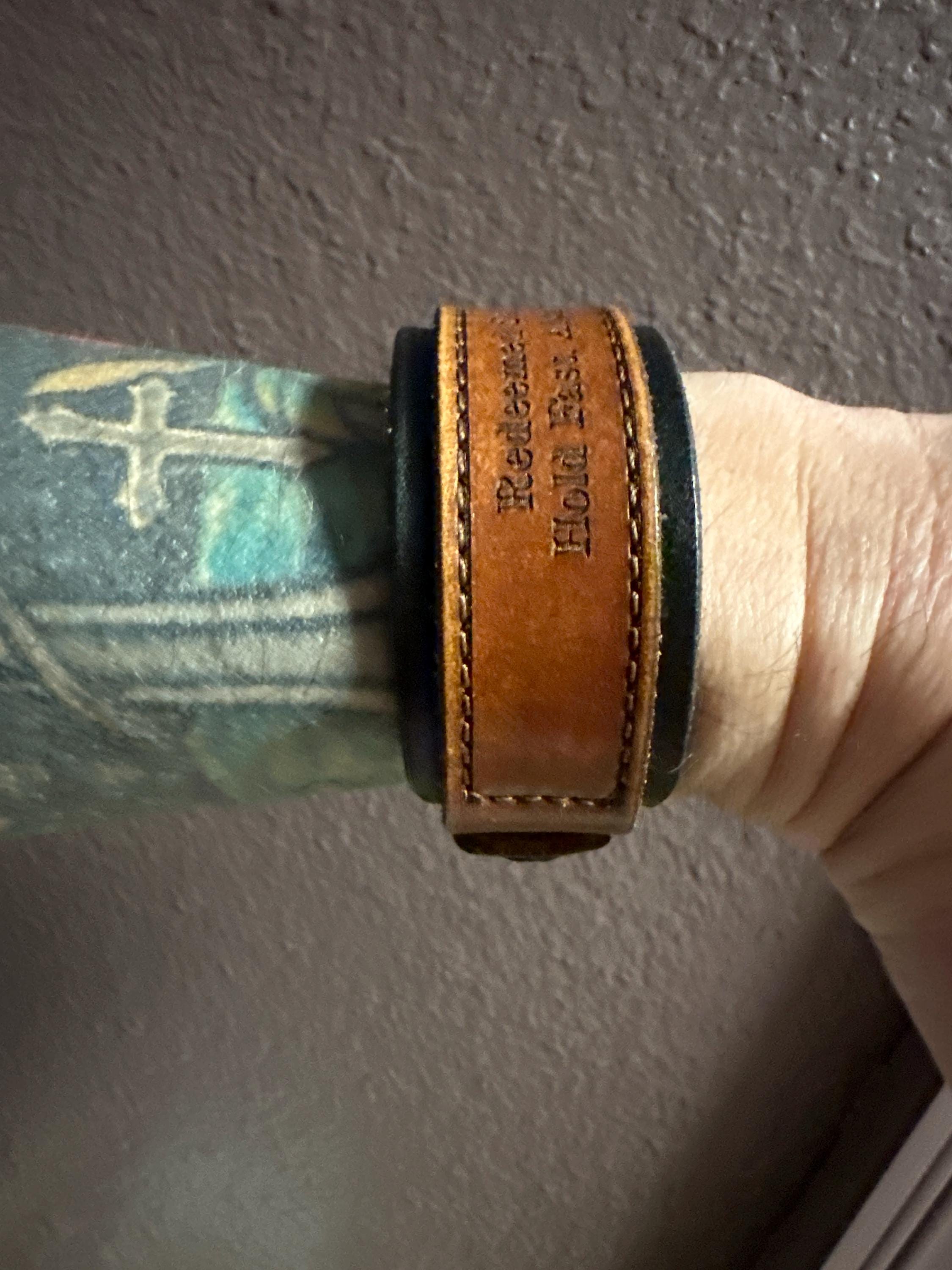 This cuff is made with 100% genuine leather, and high quality materials. Laser engraved and cut 7 ounce single bend premium leather. Hand edged, dyed, oiled,finished and stitched. Bottom layer is a 3/4 wrist wrap. Comes with cross engraving unless specified in the notes section at checkout. This cuff can be custom engraved with your quote, phrase, or date free of charge. Add your custom engraving to the notes if desired.