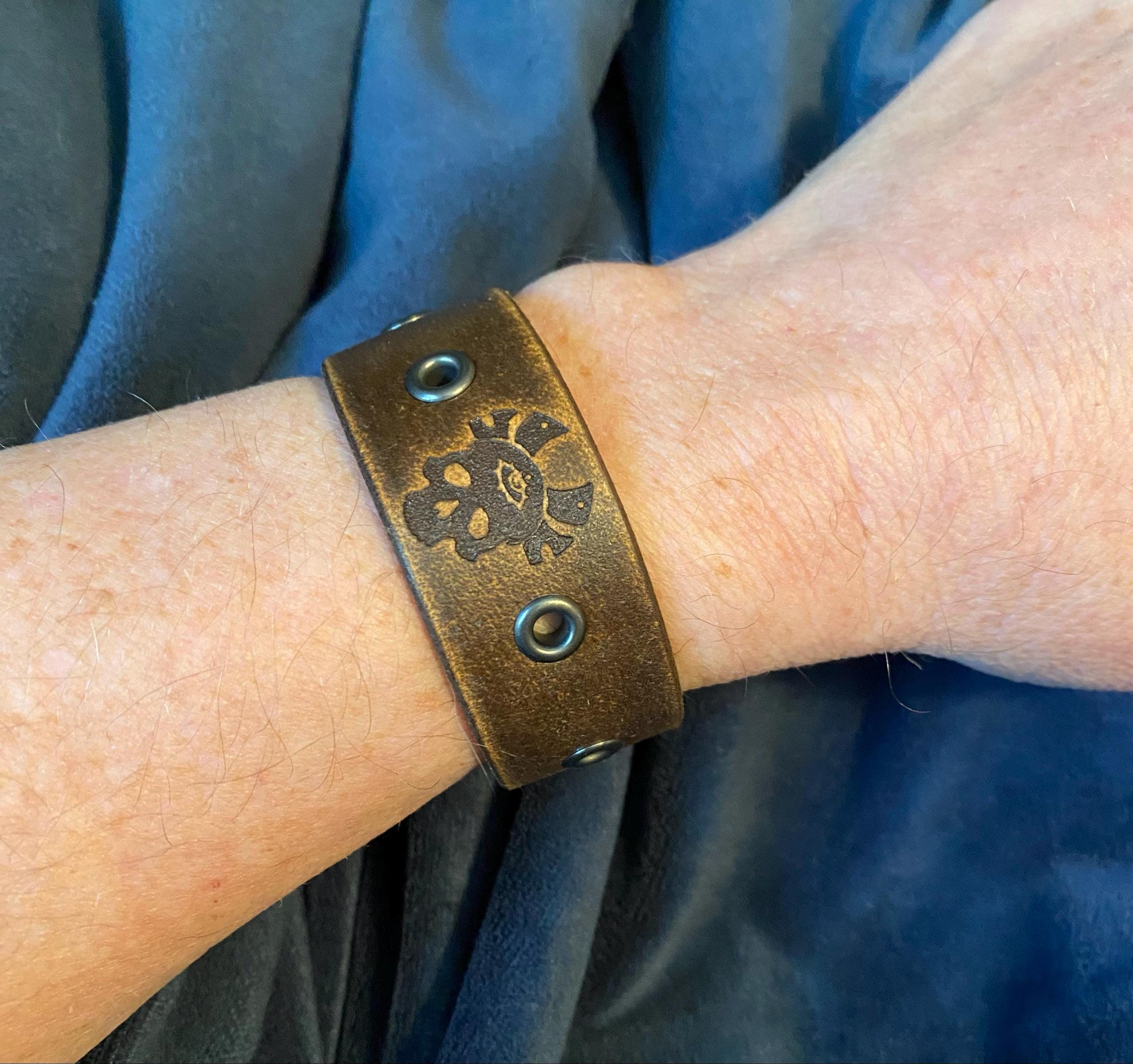 Made from premium grade 7 ounce leather. Comes engraved with the Crusader cross and shield shown centered between gunmetal eyelets. Strap is .75 inches wide. Hand dyed, distressed, oiled and finished in house. Made in America.